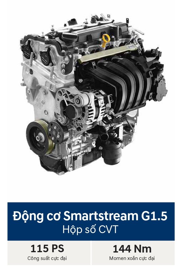 Thương hiệu xe hơi Hàn Quốc trang bị cho Accent thế hệ thứ 6 động cơ Smartstream 1.5, thay cho động cơ 1.4 trên thế hệ cũ. Động cơ 1.5 mới này tương tự các đối thủ Vios và City.