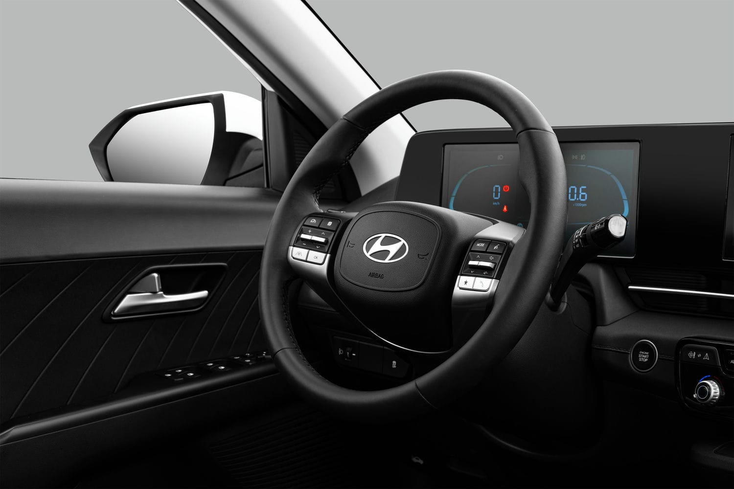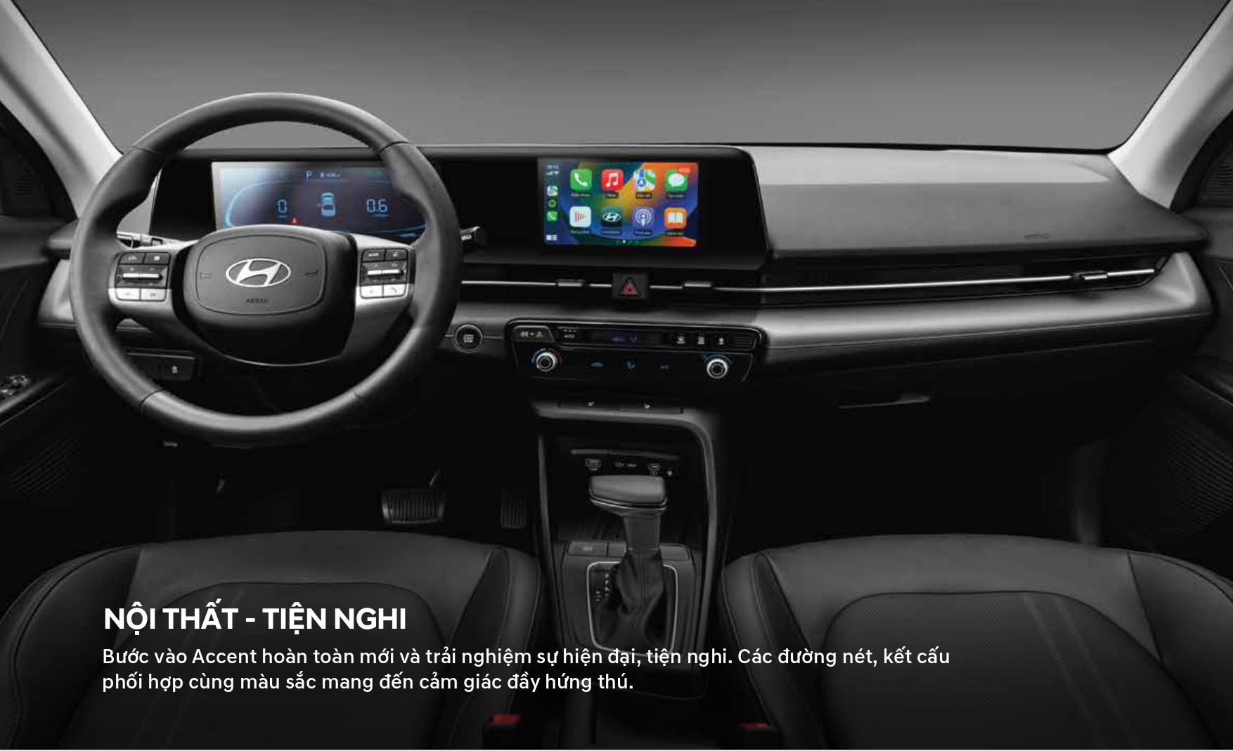 Nội thất Accent 2024 với giao diện mới. Cụm đồng hồ kỹ thuật số 10,25 inch với giao diện thay đổi theo chế độ lái. Màn hình cảm ứng giải trí 8 inch, hỗ trợ kết nối Apple CarPlay/Android Auto không dây.