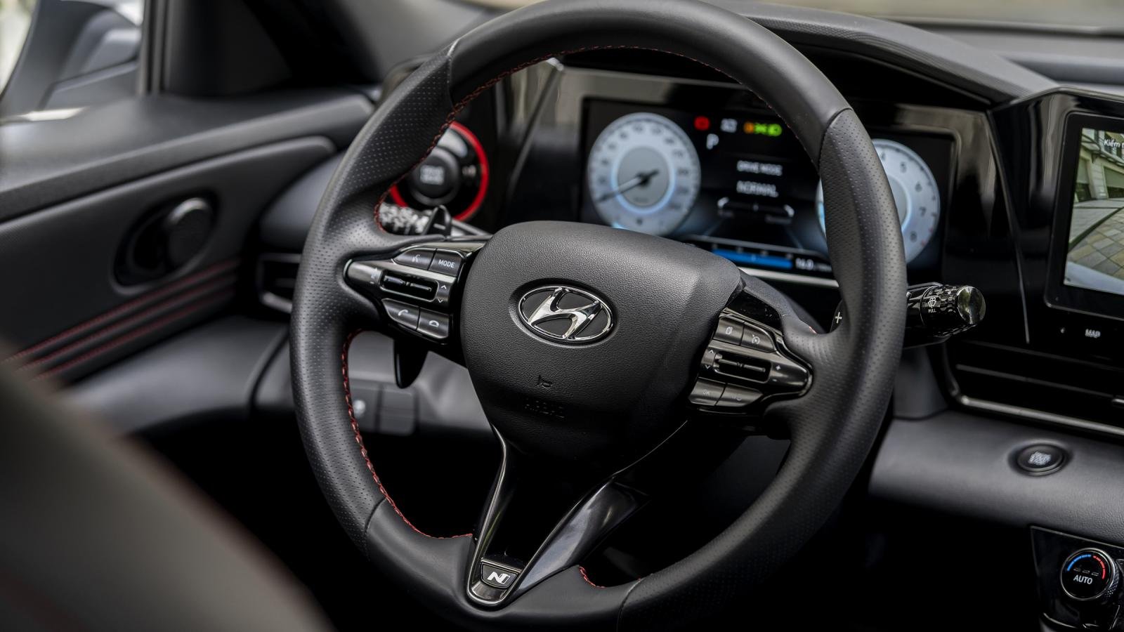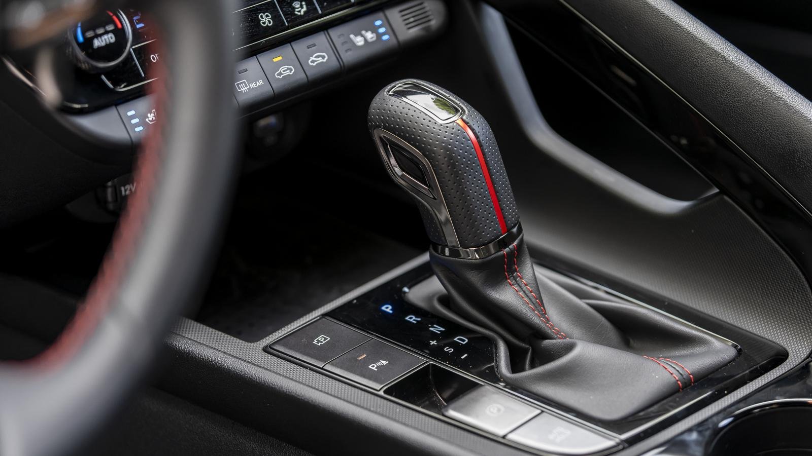 Cần số xe Hyundai Elantra mới thiết kế thể thao với các điểm nhấn chỉ khâu màu đỏ