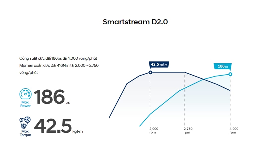 Động cơ Smartstream Diesel D2.0 (mã hiệu D4HD) cho công suất tối đa 186 mã lực tại 4.000 vòng/phút cùng Momen xoắn cực đại 416Nm tại 2.000 ~ 2.750 vòng/phút. Phiên bản này đi kèm hộp số tự động 8 cấp.