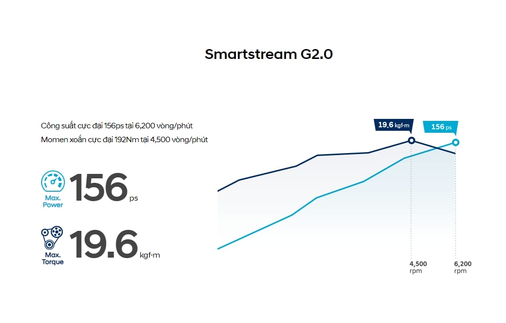 Động cơ xăng Smartstream 2.0l MPI (mã hiệu G4NM) cho công suất 156 mã lực tại 6.200 vòng/phút, cùng momen xoắn 192 Nm tại 4.500 vòng/phút. Khối động cơ này cũng được cải tiến hơn so với động cơ Nu 2.0L MPI cũ bằng các công nghệ như hệ thống quản lí nhiệt tích hợp ITMS, hệ thống di chuyển giảm thiểu ma sát FOMS,… Phiên bản sử dụng động cơ này được đi kèm hộp số tự động 6 cấp.