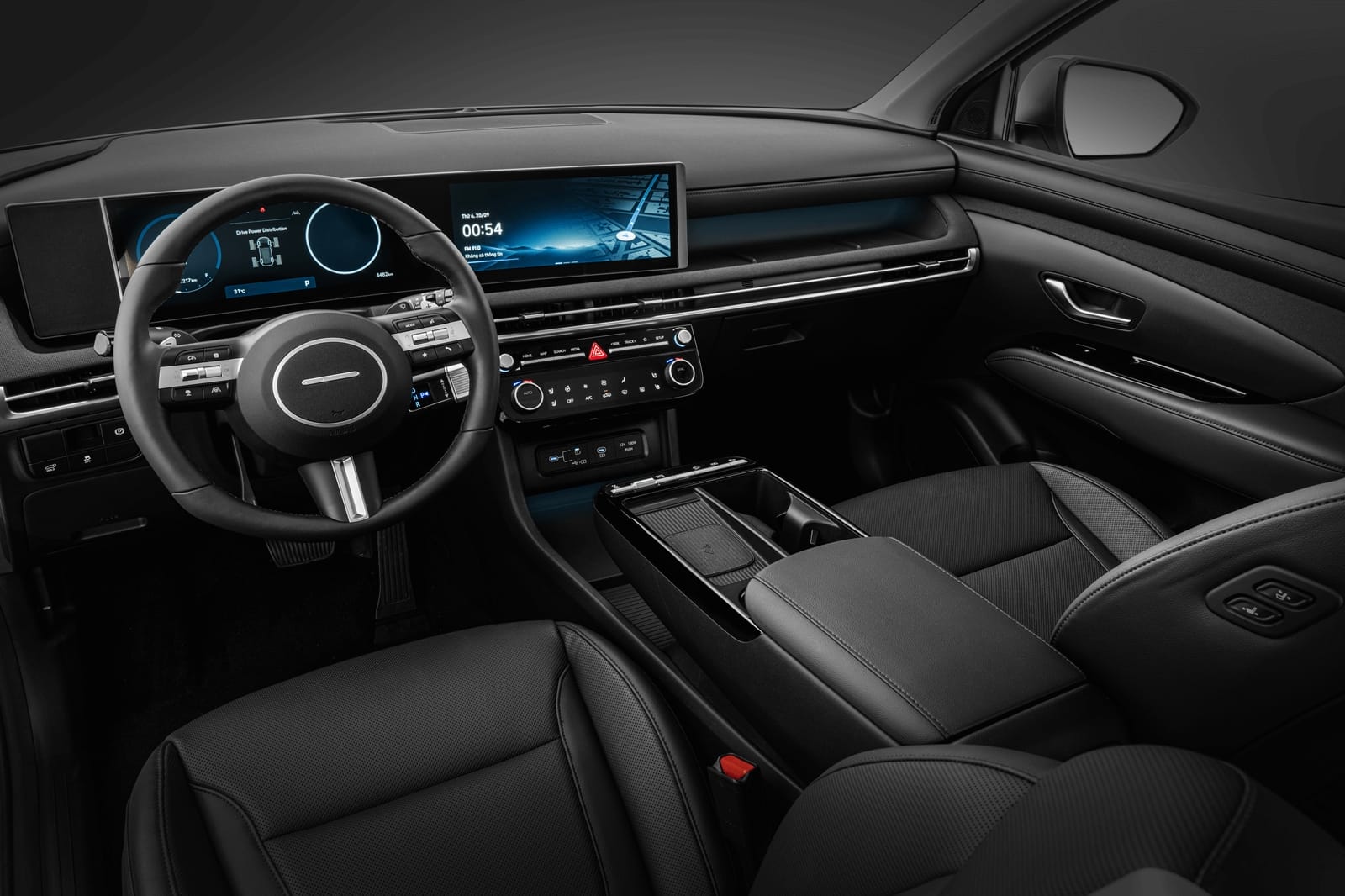Điểm nhấn của không gian nội thất của New Tucson là cụm 2 màn hình thông tin và màn hình giải trí có kích thước 12.3 inch mỗi màn được nối liền mạch với độ nghiêng vừa phải hướng về người lái. Phong cách thiết kế này tương đồng với All New Santa Fe mới được ra mắt gần đây.